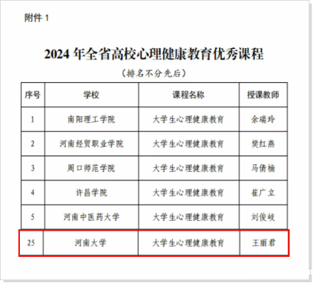 近日,河南省委教育工委、河南省教育厅公布了2024年全省高校大学生心理健康教育优秀课程及心理危机干预优秀案例遴选结果,我校教育学部心理学院王丽君老师主讲的《大学生心理健康教育》课程获评“2024年全省高校心理健康教育优秀课程”,医学院尚艳青、赵水仙老师申报的心理危机干预案例获评“2024 年全省高校心理危机干预优秀案例”。此次评选活动自今年8月启动,经资格审查、专家评审、综合评议、结果公示等环节,评选出2024 年全省高校心理健康教育优秀课程25个,2024 年全省高校心理危机干预优秀案例50个。
