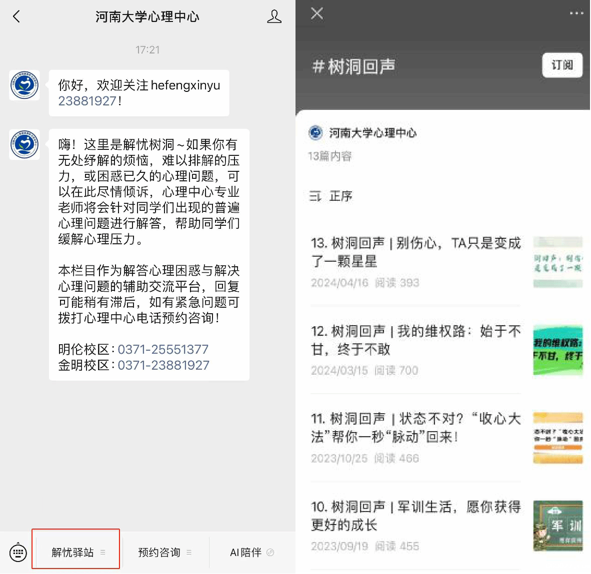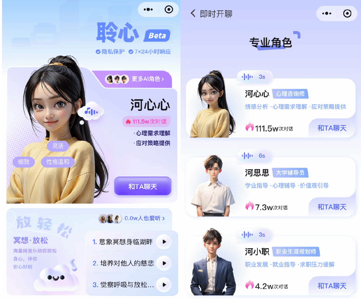 关注“必威betway中文版官网心理中心”微信公众号,点击下方菜单栏中的“AI陪伴”就可以和AI伙伴对话啦!在这里,你可以见到河心心,河思思,河小职。他们都是你的倾听者,都想帮你答疑解惑~
