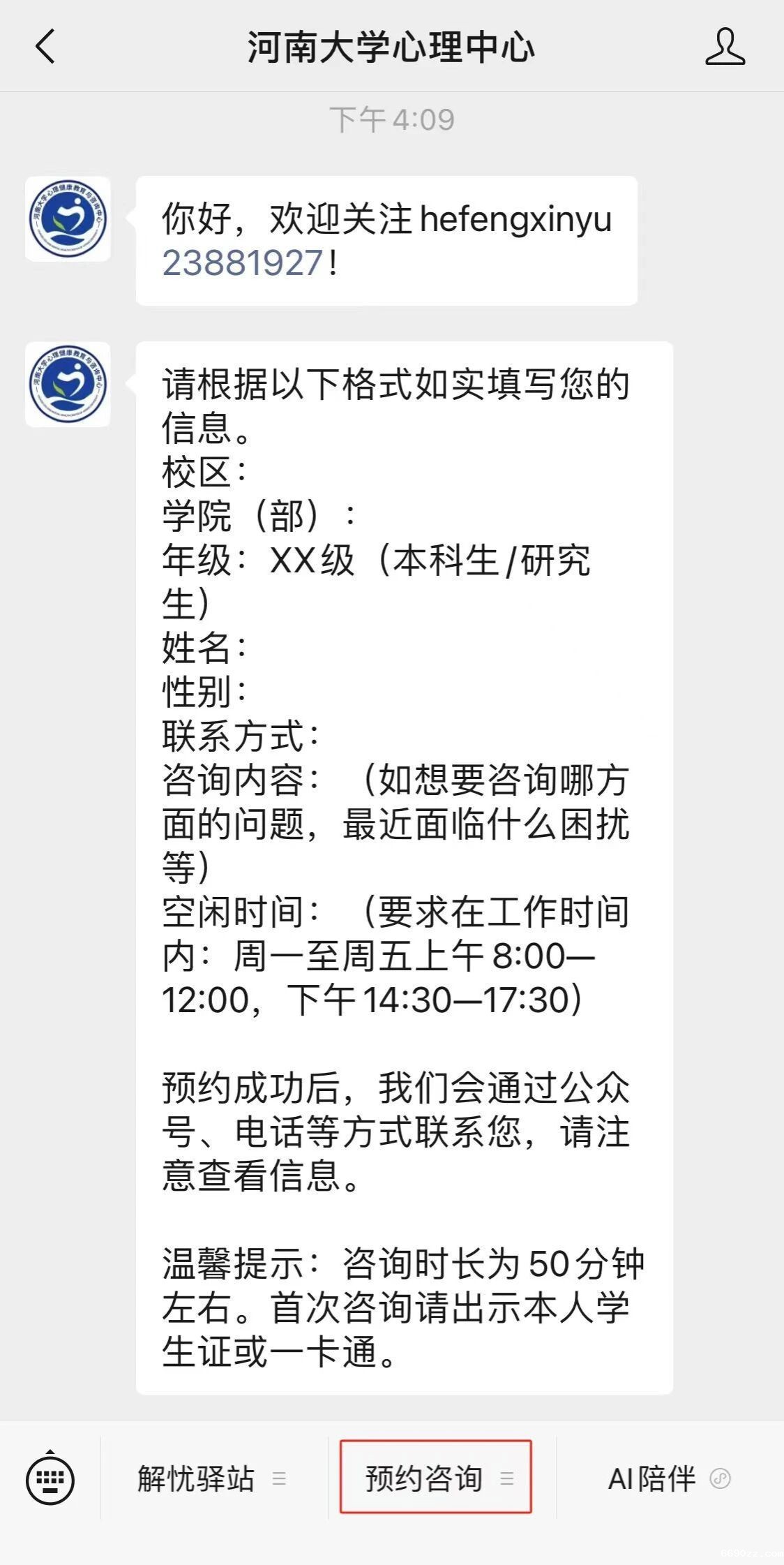 如果以上这些无法解决你的小烦恼,你可能有专业的咨询需求,寒假期间仍可以在微信公众号上预约线上咨询~点击下方菜单栏中的“预约咨询”,要根据相应格式填写个人信息哦!