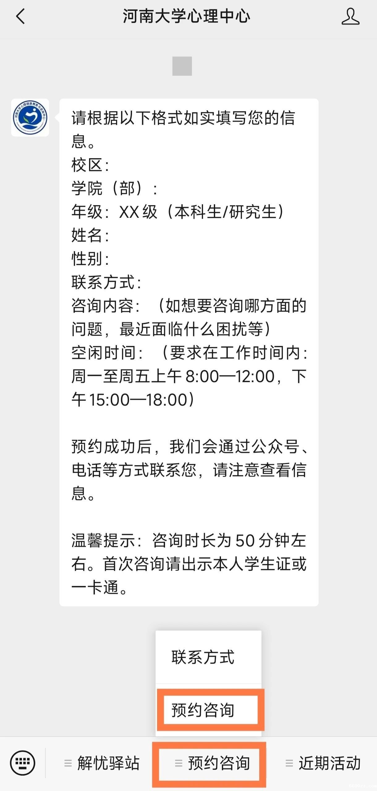 如果你有专业的心理咨询需求,仍可以在微信公众号上,点击下方菜单栏中的“预约咨询”,根据相应格式提供你的个人信息来预约线上心理咨询。