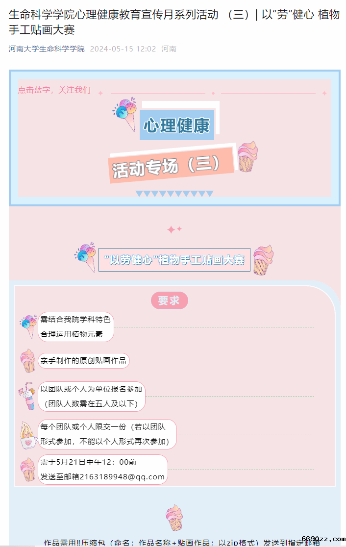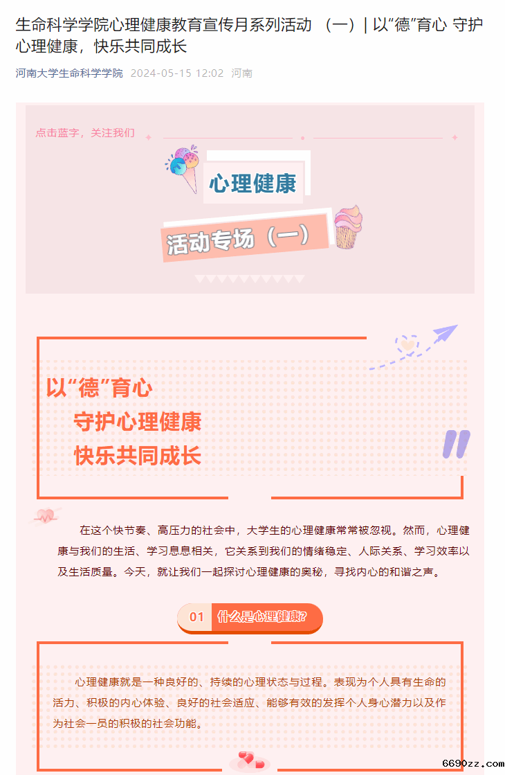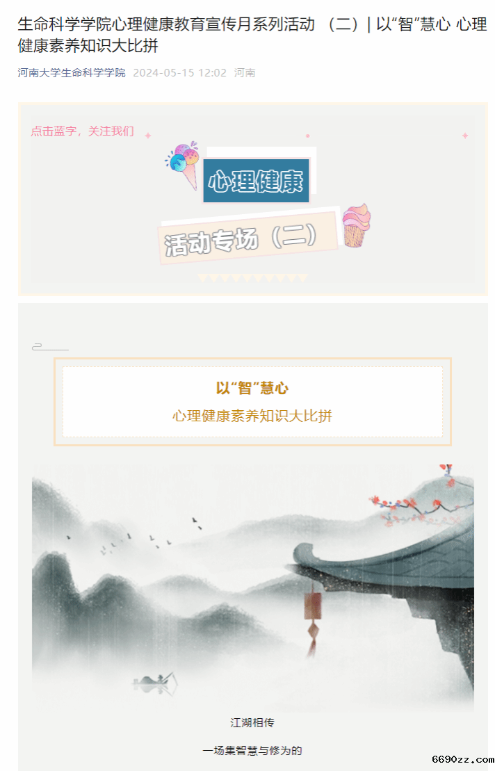 学院以学院官网、微信公众号等渠道积极宣传,科普了什么是心理健康以及如何去维护心理健康,同时结合线下心理健康工作站的形式联合展开。