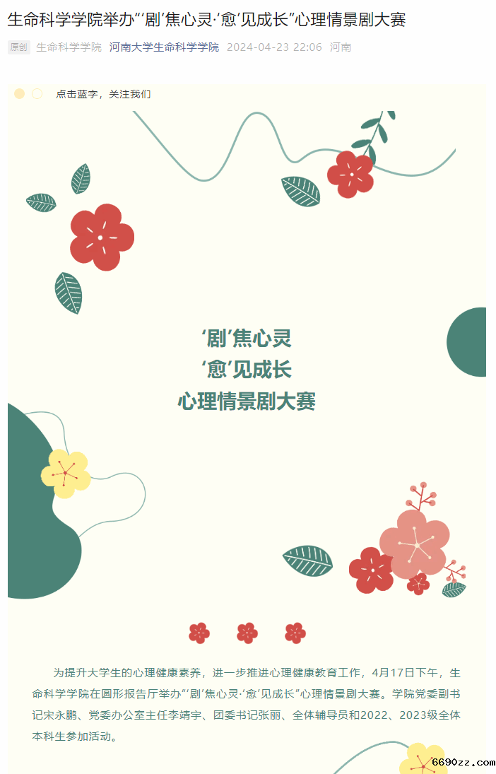 积极开展心理主题班会、心理委员工作能力提升培训以及“以智慧心,青春绽放”为主题的线上答题,面向生命科学学院全体师生进行了一场心理健康素养知识大比拼。