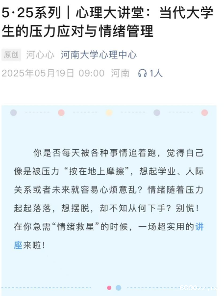 马教授结合专业知识与实际案例,为同学们带来了科学实用的压力应对与情绪管理方法。帮助同学们在压力中寻找成长契机,将情绪转化为前进动力,为他们的未来发展奠定坚实心理基础,助力他们在大学生活中绽放青春光芒。